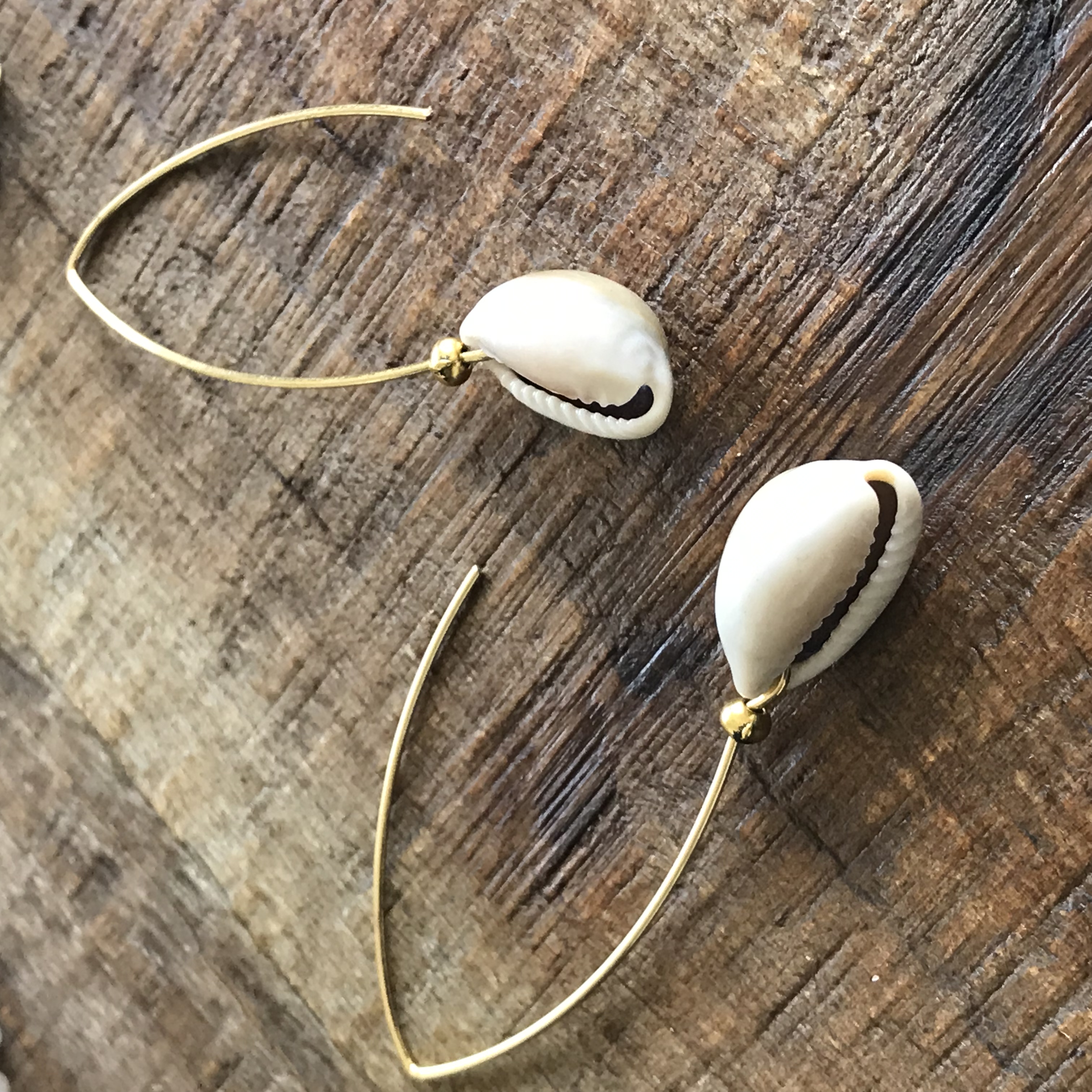 Cowrie shell on dainty earring hang. Available in gold or silver