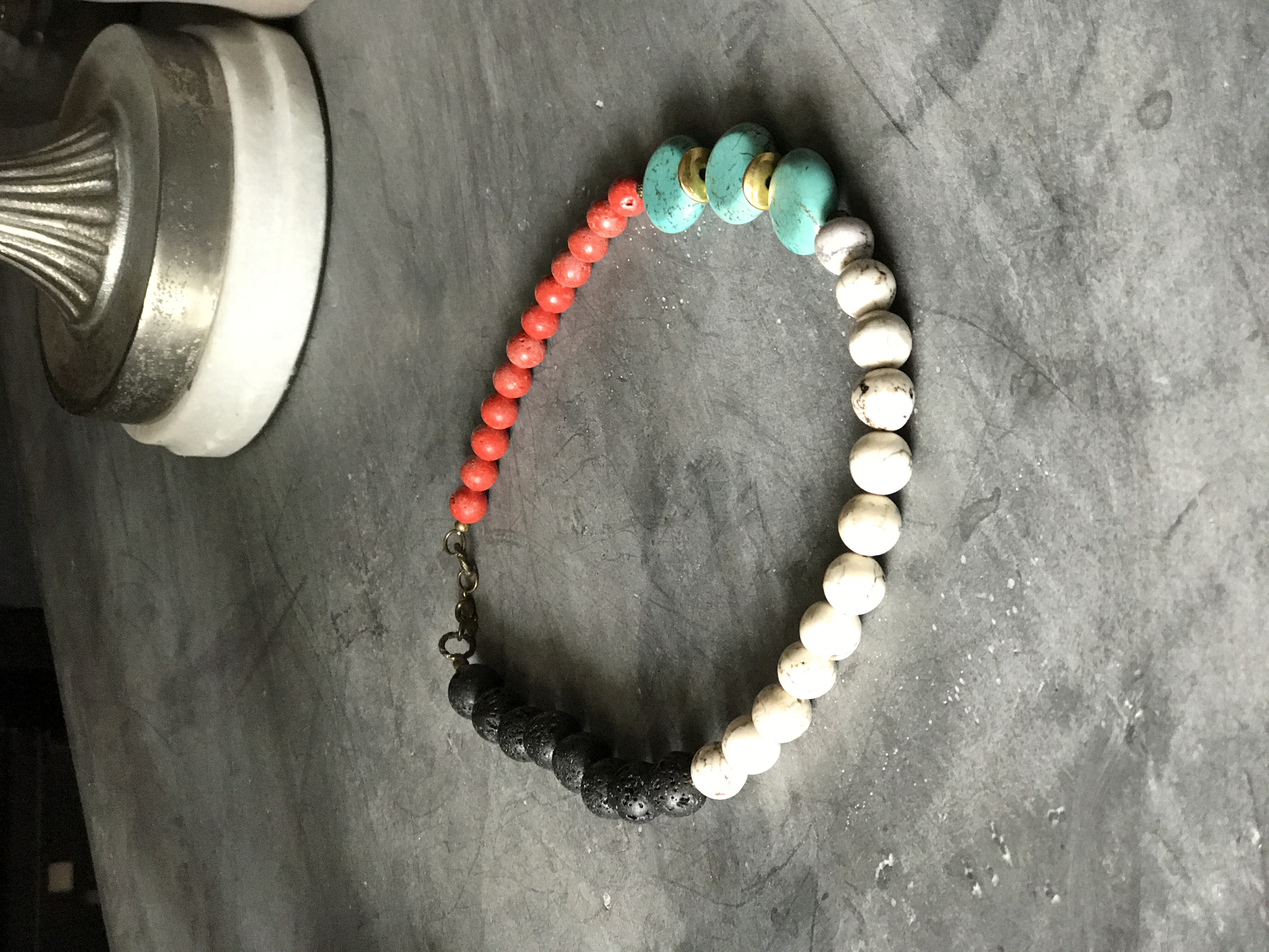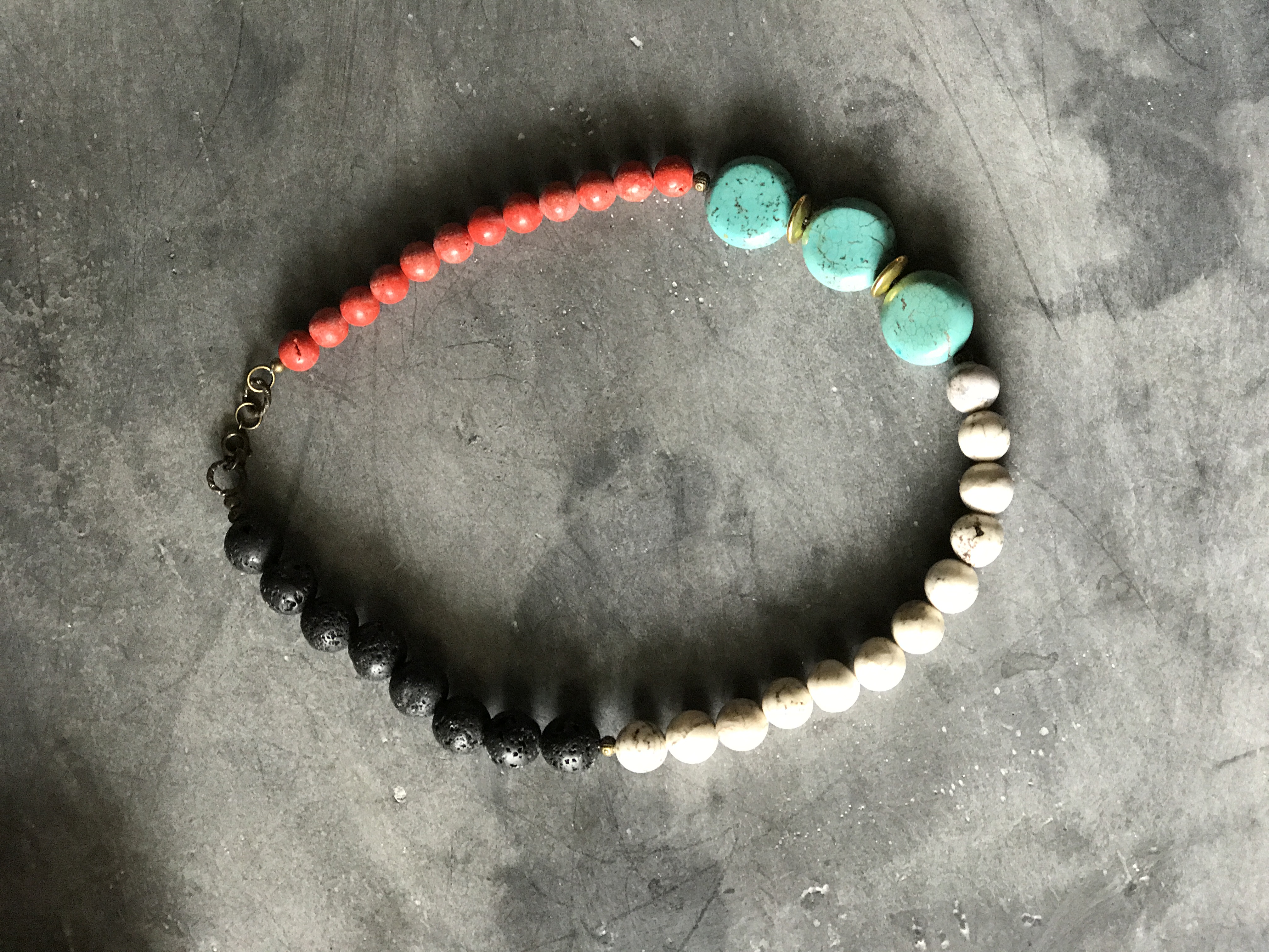 This handmade necklace features semi-precious stones (lava stone, turquoise, howlite) w/ antique gold accents and sits just at the neckline for a boho inspired look.