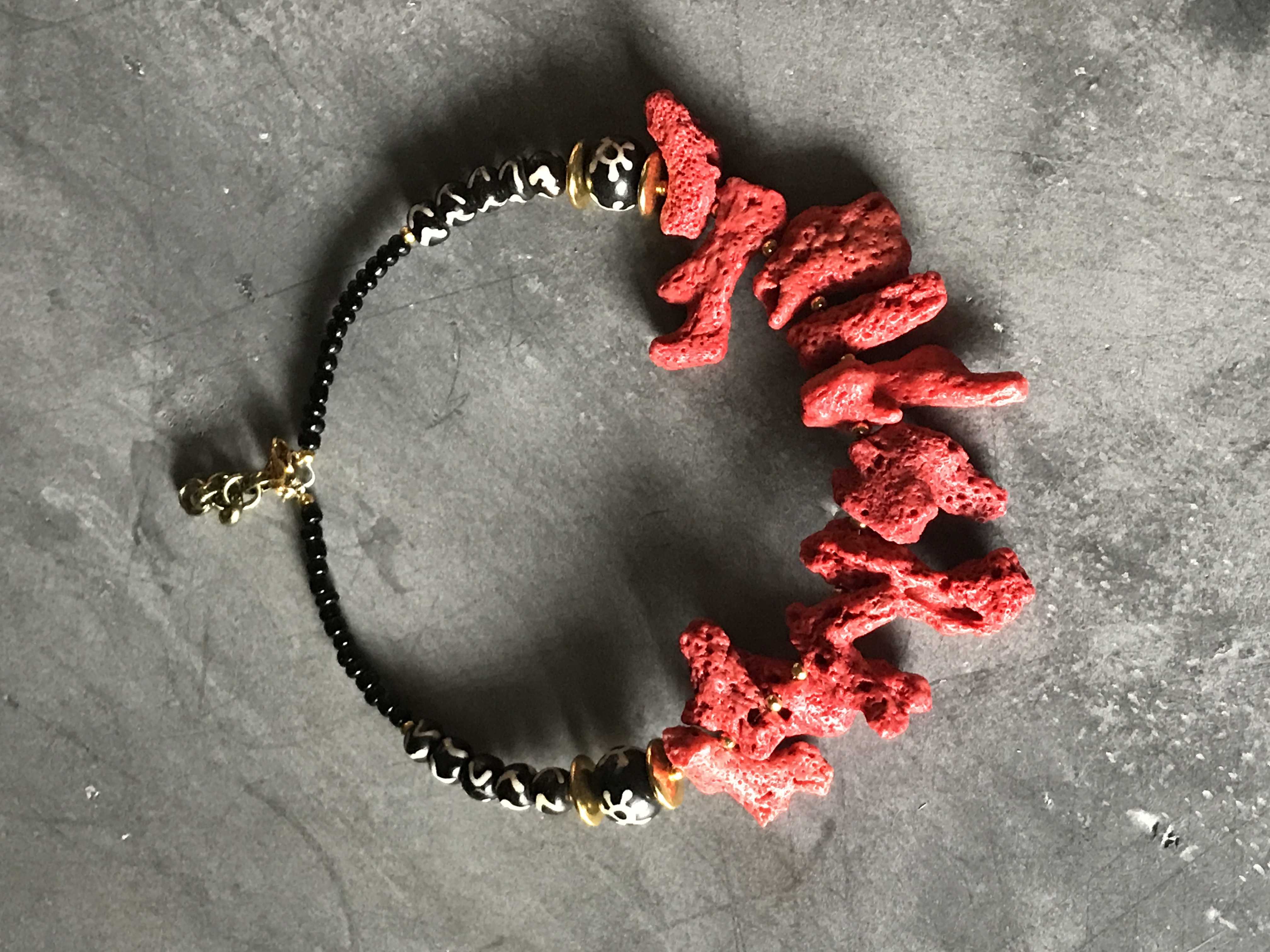This sexy piece is adorned with red sponge coral, bone beads and gold accent bead. It sits just at the collar bone.